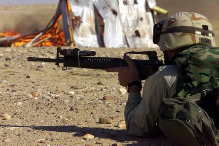 M4卡宾枪:许多海军陆战队员都希望能够装备这件比M16[均指M16A2]更短的武器,他们说它更适合于在城市地形的战斗,因为它适用于狭窄的使用空间。而且大部份参战士兵都乘坐车辆平台参加战斗,比较小的武器在上下车时都会更方便。 有很多的意见指M16太长,在城市战斗中很麻烦。一些海军陆战队甚至干脆使用从伊拉克人手中缴获的AK-47,另一些人则在进入建筑物内时使用手枪来代替步枪,以便在狭窄的空间中更具有灵活性。