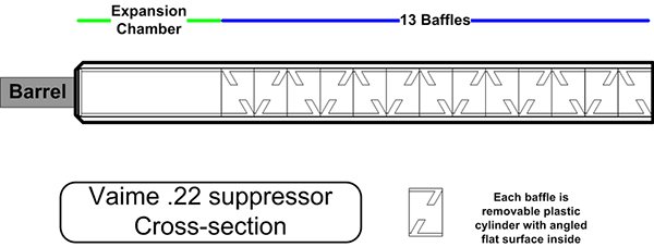 ![]() 采用塑料材料制作Z形隔板的Vaime .22口径消声器的结构示意图 |